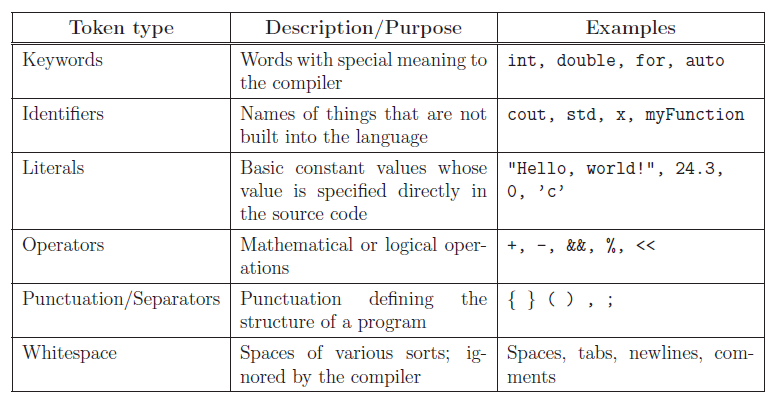 Tokens are the minimals chunk of program that have meaning to the compiler – the smallest meaningful symbols in the language. Our code displays all 6 kinds of tokens, though the usual use of operators is not present here: